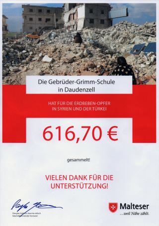 Weil Ihnen das Schicksal der Erdbebenopfer in der Türkei und Syrien sehr nahe ging, haben die Schüler der Gebrüder-Grimm-Schule in Daudenzell auf Anregung einer Schülerin, deren Familie durch diese Naturkatastrophe unmittelbar betroffen ist, einen Pausenverkauf in der Schule organisiert. Die Eltern der Schüler stellten über einen Zeitraum von 2 Wochen fast täglich Muffins, Kuchen, Cookies und andere Leckereien zur Verfügung. Auch haben die Schüler der Koch-AG Kuchen & Co. gezaubert, die ebenfalls zu den kulinarischen Köstlichkeiten im Verkauf beitrugen. In den 2 Aktionswochen im März wurden durch diesen Pausenverkauf insgesamt € 441,70 eingenommen.