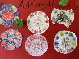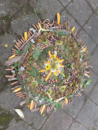 Zu sehen war auch ein Herbstmandala, zusammengesetzt aus Früchten, die eine Gruppe während ihres Waldtages gesammelt hatte. Bemalte Kerzen und mit Herbstmotiven und bedruckte Taschen konnten gekauft und Apfelchips probiert werden.